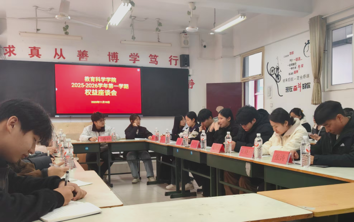 教育科学学院在2025年11月19日行知楼511教室成功举办学生权益座谈会,共话校园权益保障与发展,为进一步加强学院与学生之间的沟通交流,切实保障学生权益,营造和谐、民主、进步的校园氛围,本次座谈会邀请了学院领导、教师代表、各学院团总支及权益部负责人、学生代表等共同参与,围绕学